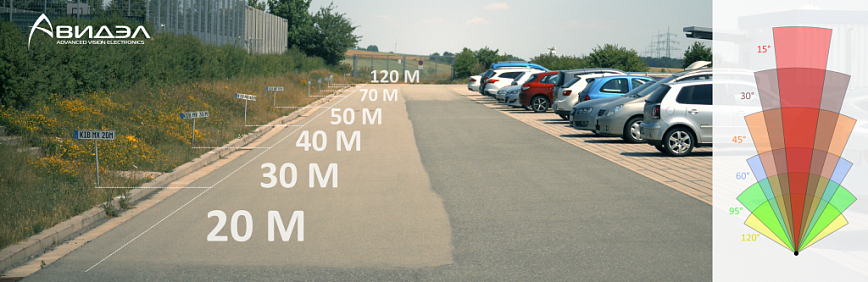 Благодаря этим изображениям вы можете определить поле зрение камеры с выбранным объективом, а также увидеть, что именно и с какой детализацией будут видны объекты, расположенные в кадре. Для вашего удобства на тестовой площадке каждые 10 метров расставлены таблички в виде автомобильного гос. номера с указанием точного расстояния до каждой из них.
